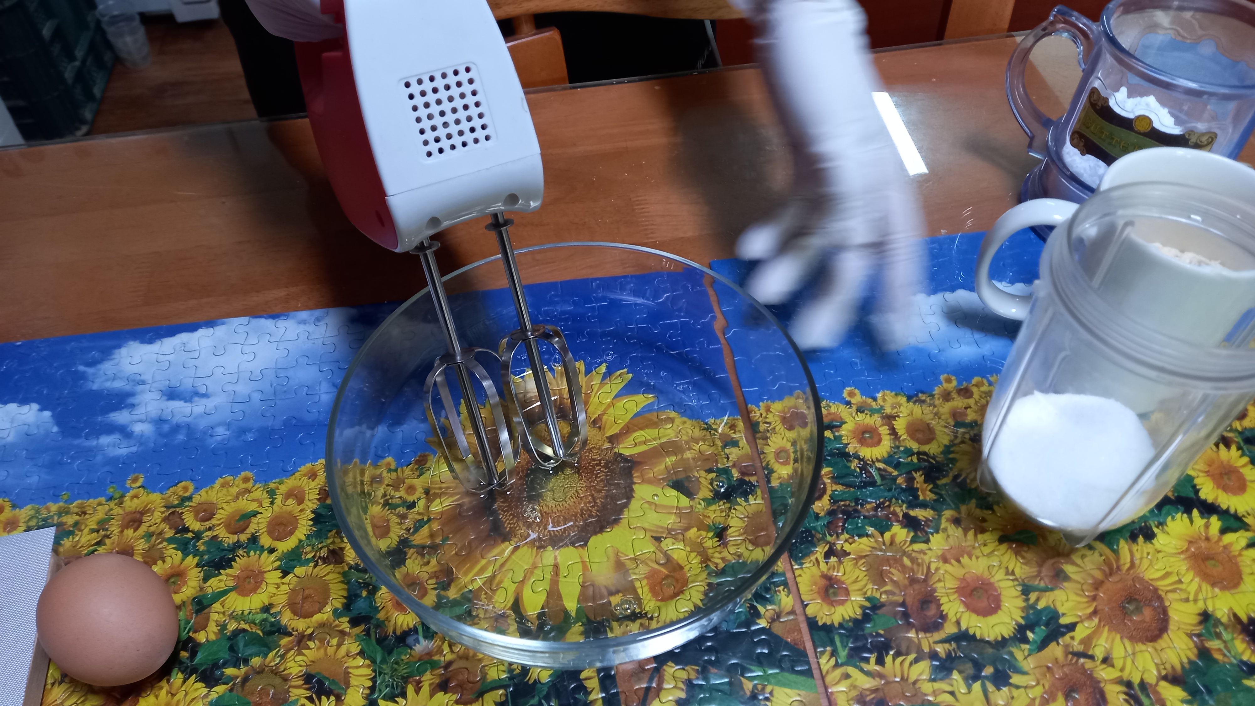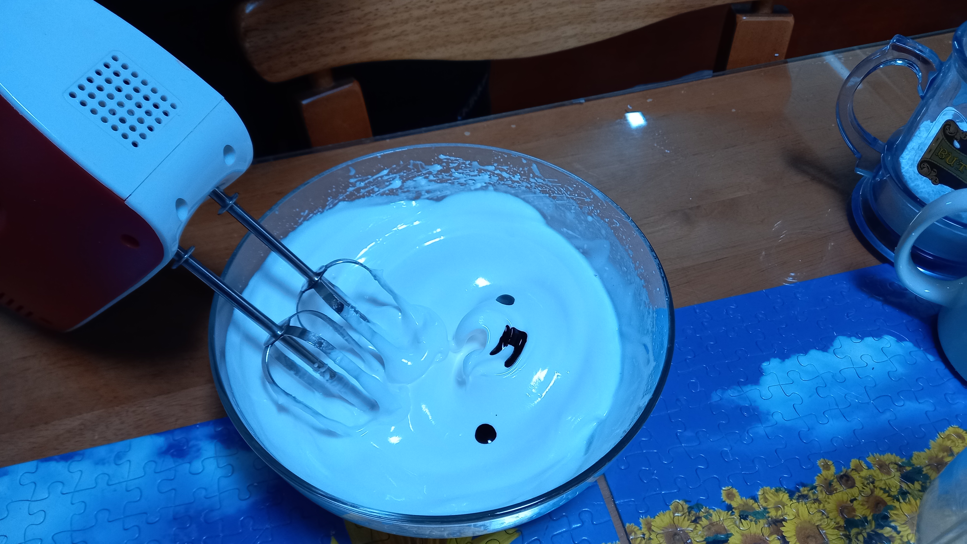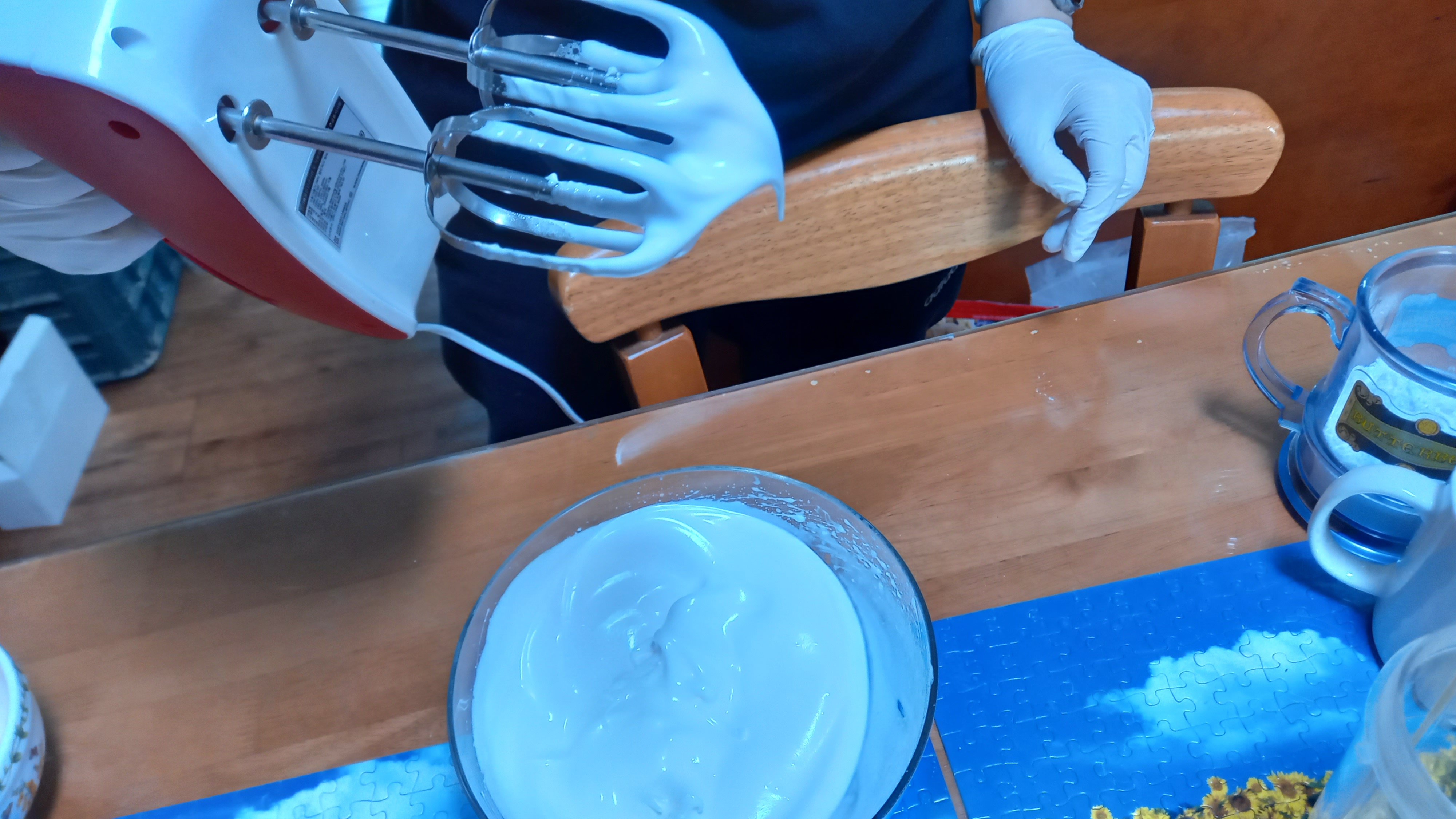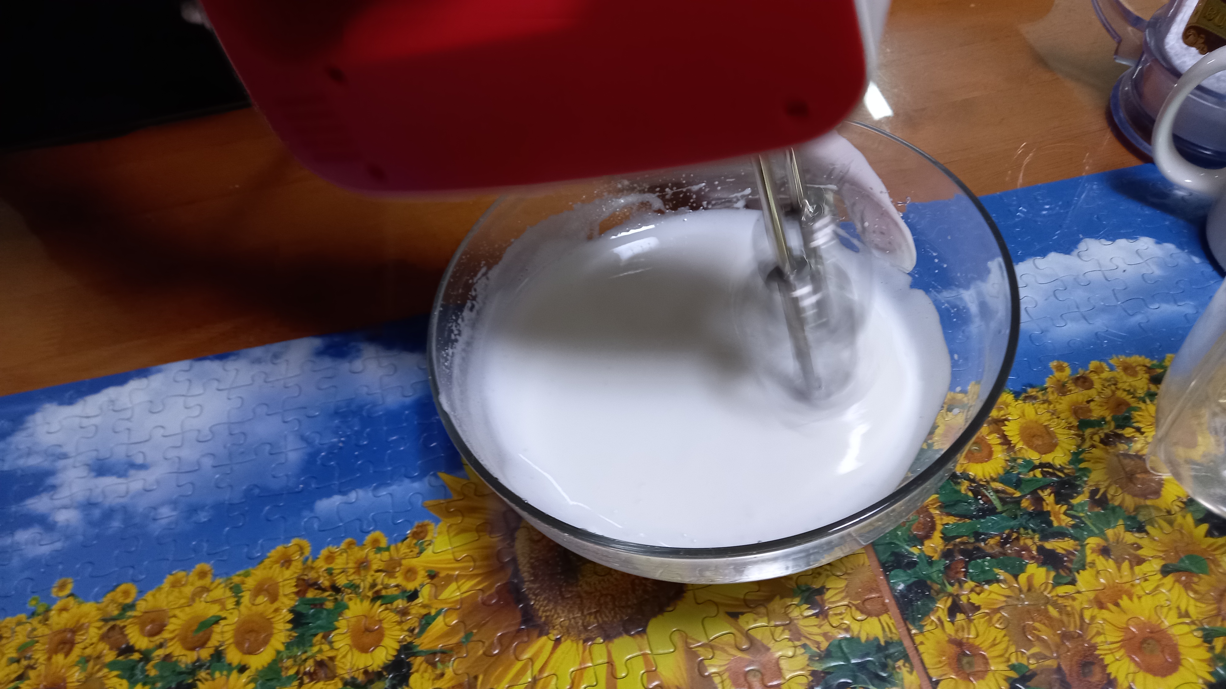 그리고 투명 컵에 흰자를 넣고 2분정도 거품기로 돌리고 설탕을 3번 나눠 넣고 거품기로 돌려요.