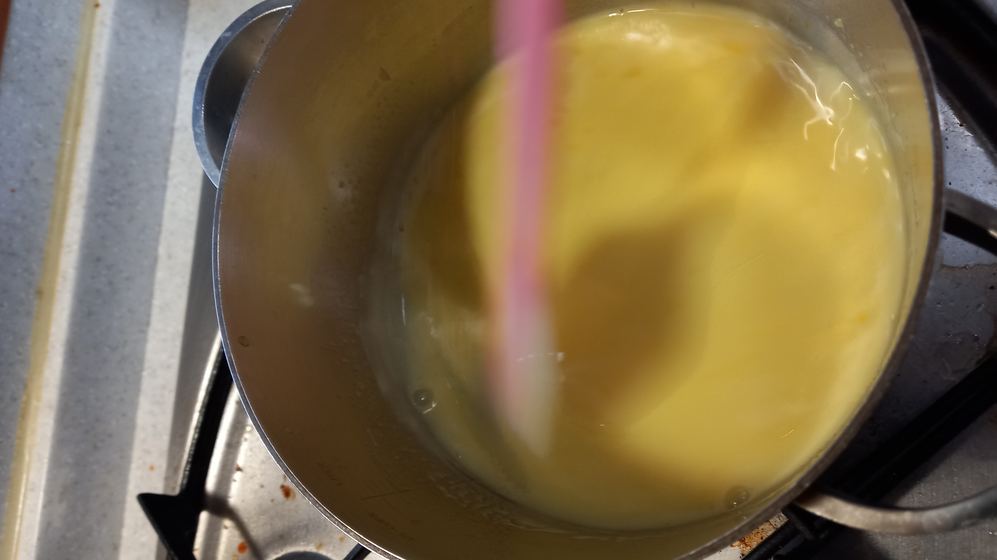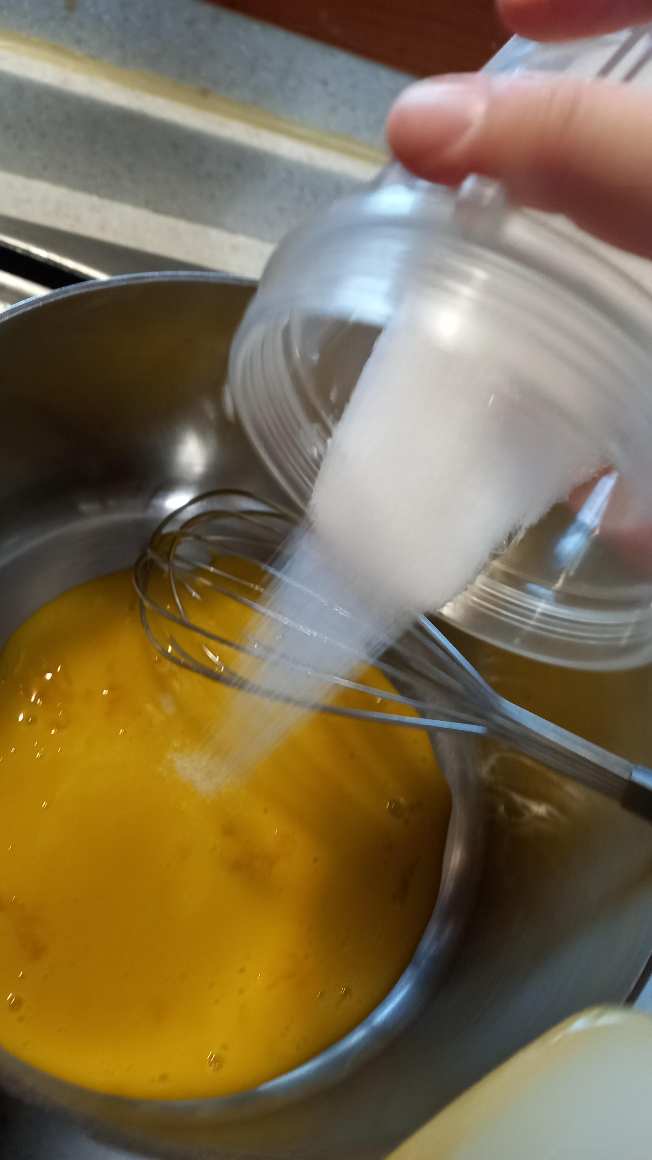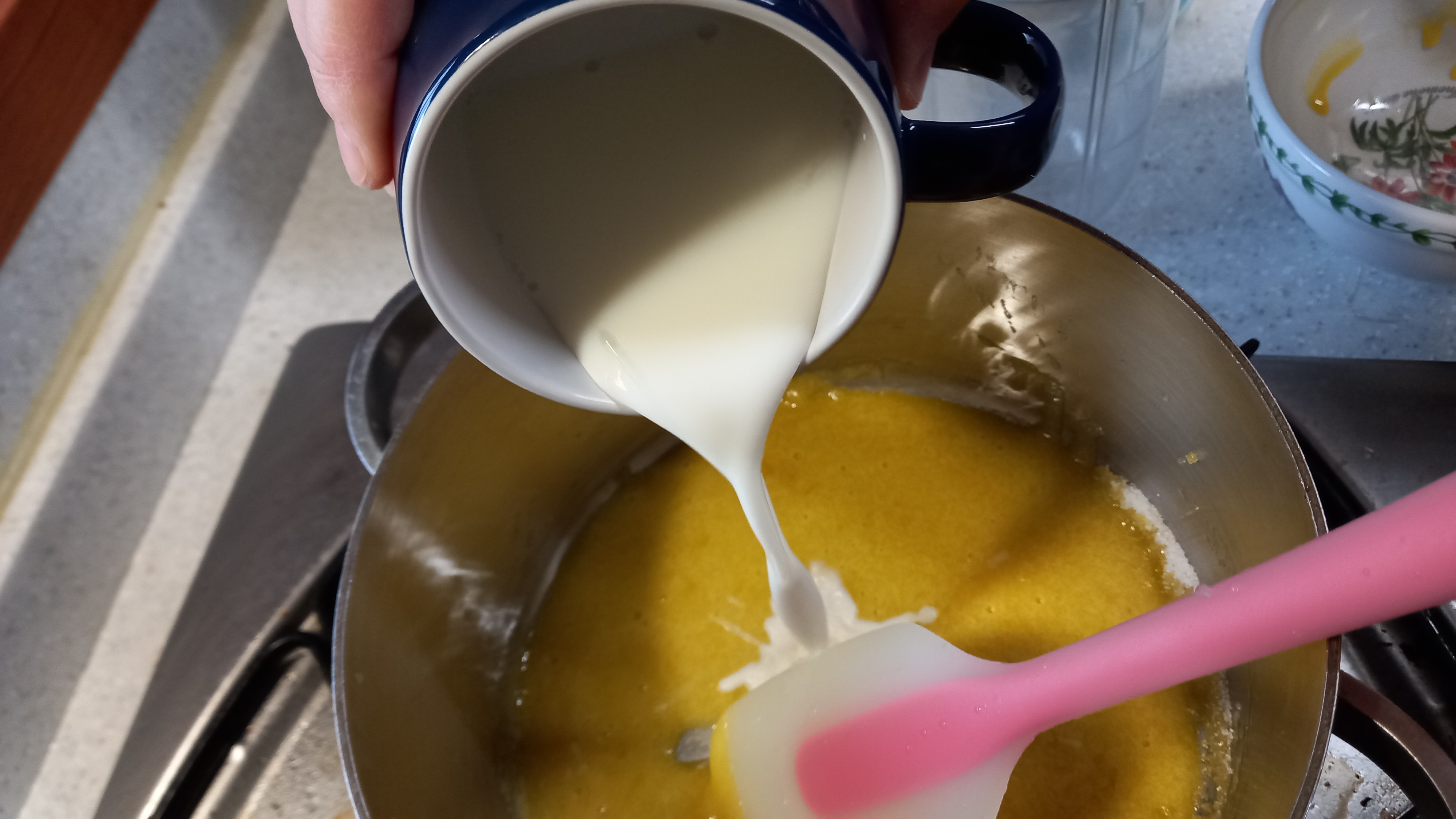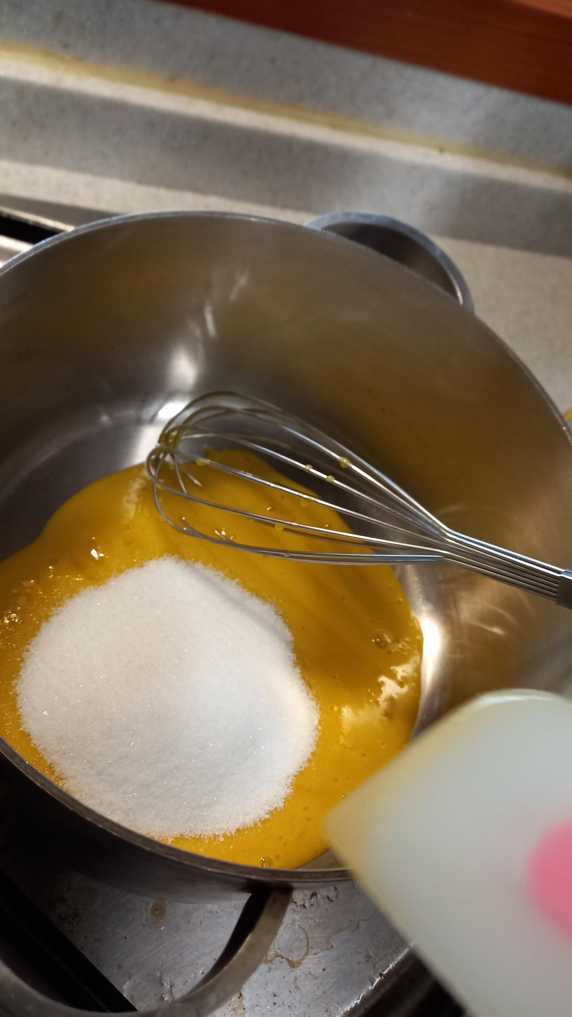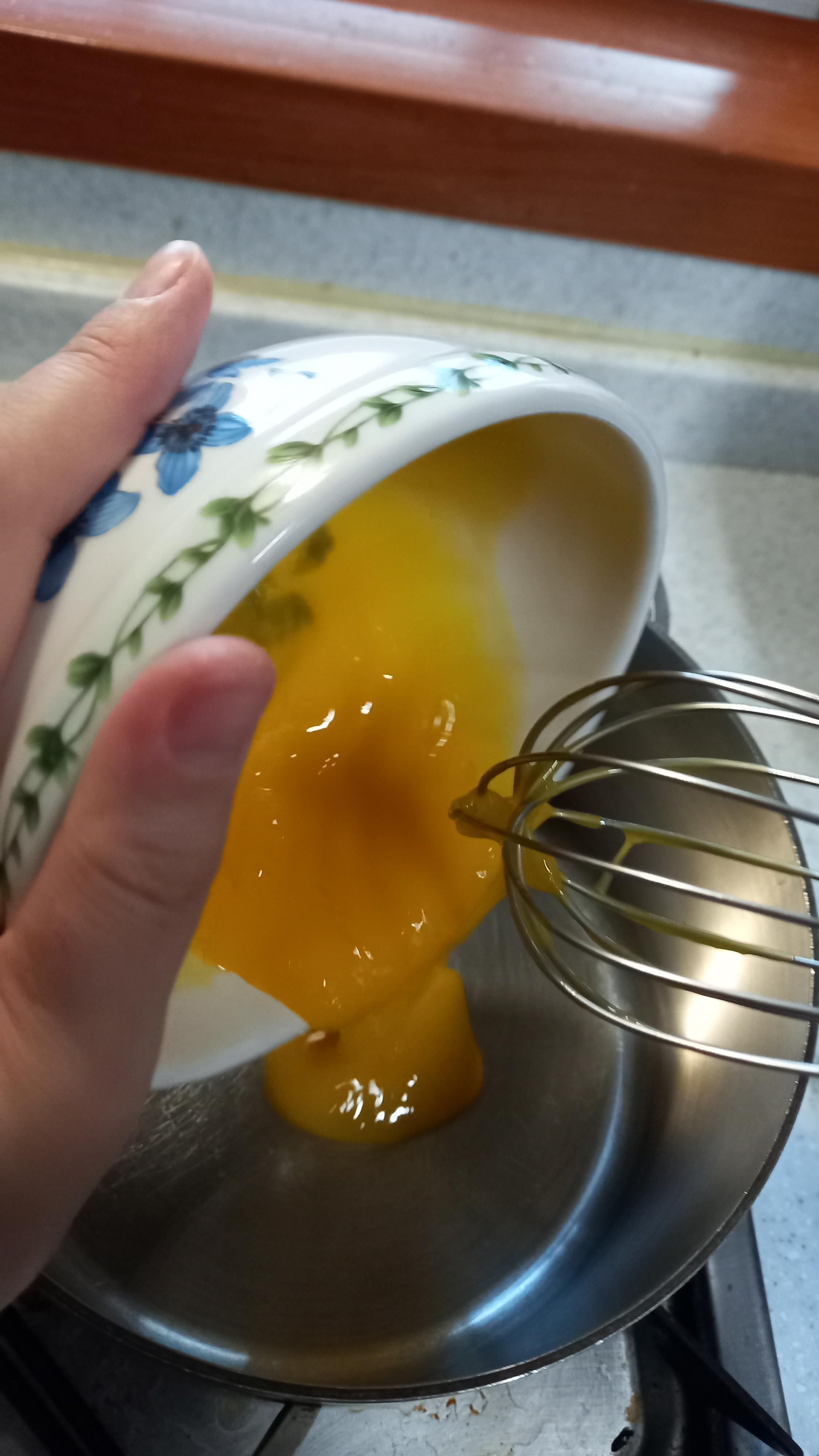 우선 계란노른자를 풀어서 냄비에 넣고 설탕,우유를 넣고 약불에 노른자가 익을 때까지 살짝 저어줘요.