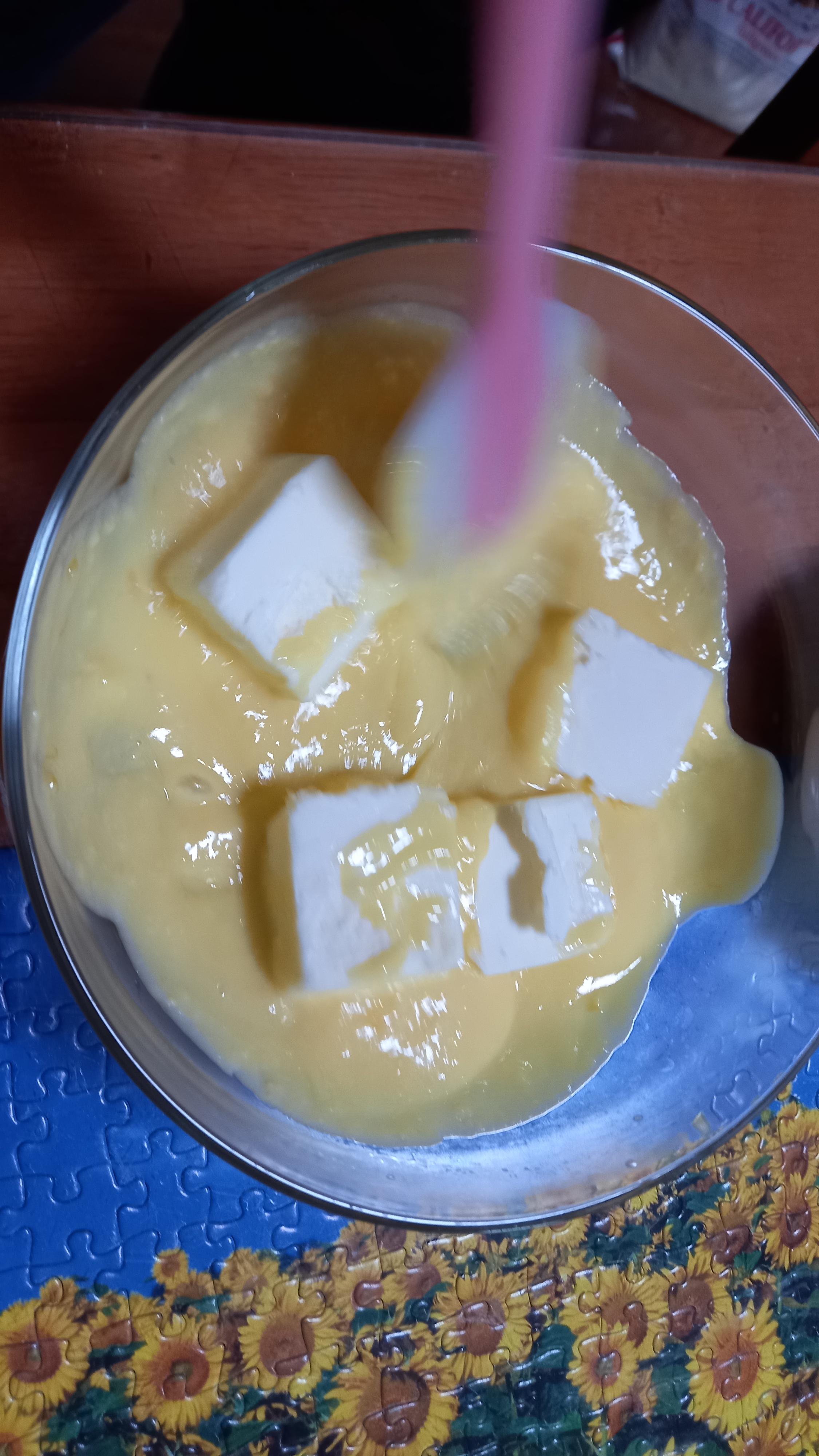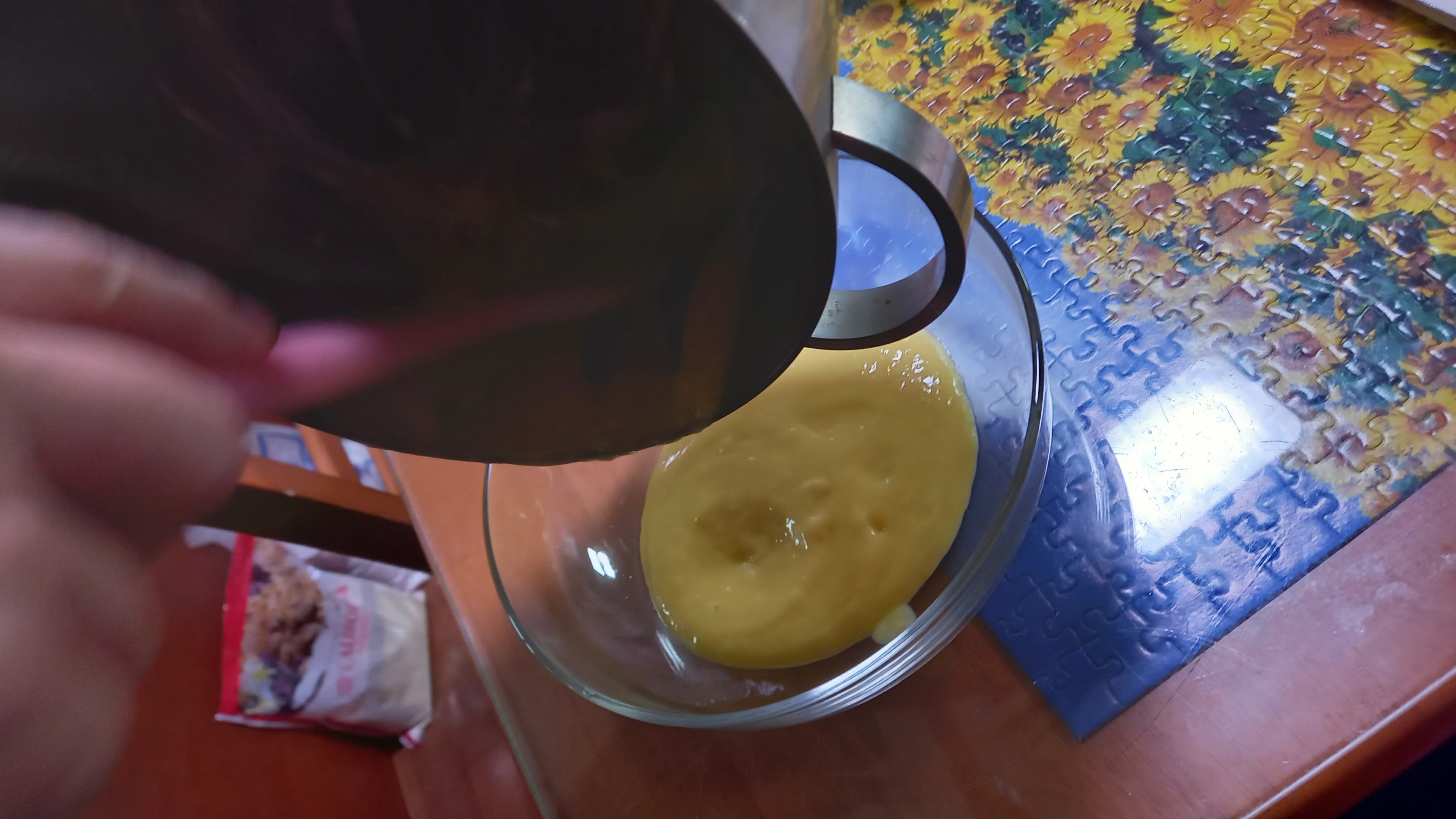 노른자가 익었다 싶으면 냄비에서 투명 볼에 옮겨 담고 버터를 넣고 거품기로 저어줘요.
